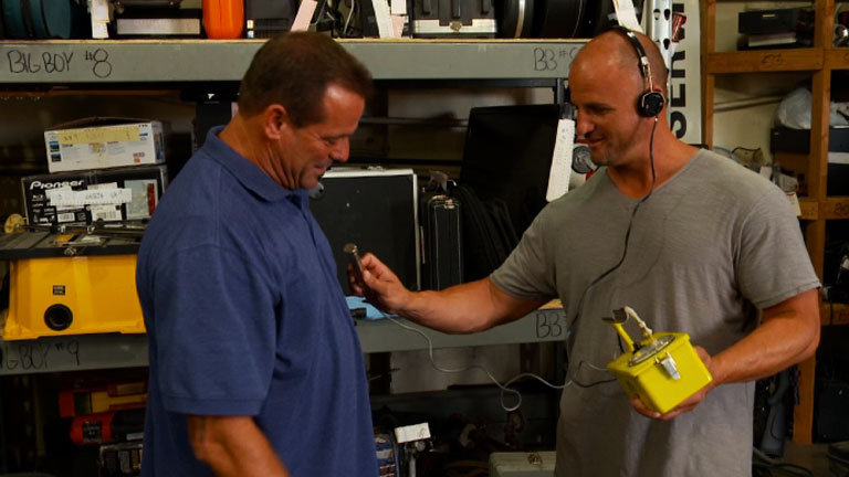 Steve and Antonio play around with a vintage geiger counter that Steve's planning to trade.