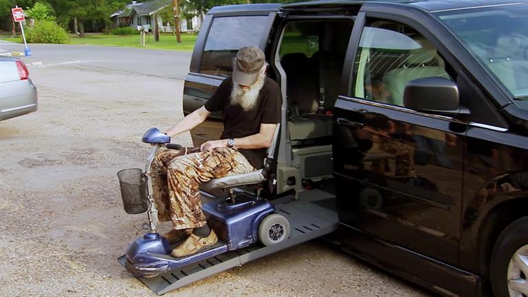 In this scene from the episode Scoot Along Si, Si rents a mobility scooter after he claims he was injured in a car accident.