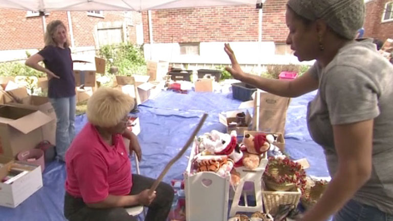 Dr. Hannan works with Lisa and her mother to sort through more of Lisa's household items outside. Lisa's mother shares her thoughts and opinions about Lisa's progress and cleaning goals which frustrate Lisa and cause her to lose motivation.