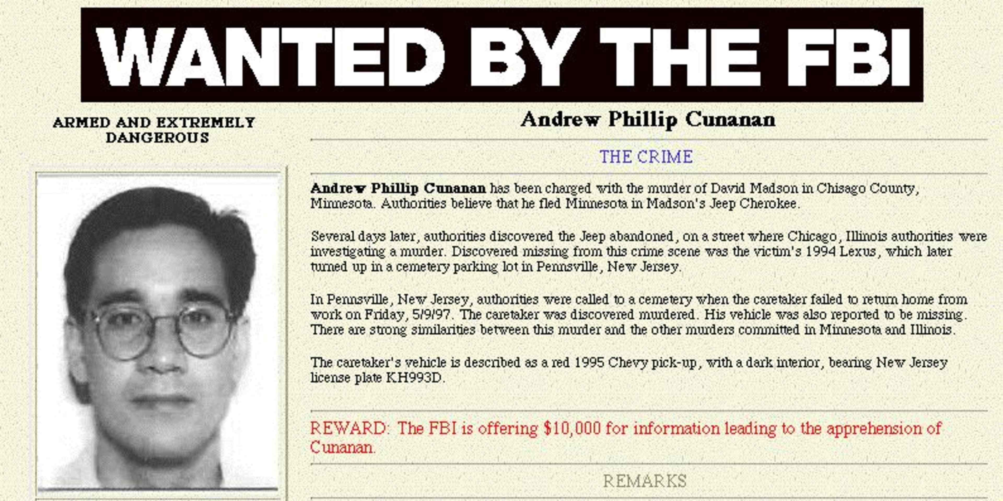 Cunanan, 27, was added to the FBI’s 10 Most Wanted Fugitives list on June 12, 1997, and remained there until his death by suicide on July 23, 1997. He was hiding on a houseboat in Miami Beach before his death, which occurred eight days after he killed Versace on the steps of the fashion icon’s opulent Miami home. Versace was the fifth person Cunanan had killed in cold blood—the previous victims (David Madson, 33; Lee Miglin, 72; William Reese, 45; Jeffrey Trail, 28) lived in other states, and Cunanan had stolen cars to travel across the country and commit his crimes.
