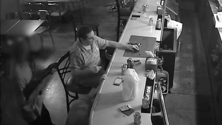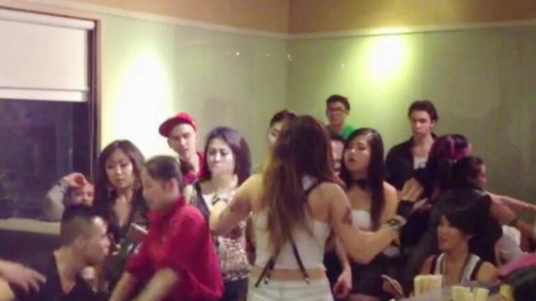 A plate shatters on a woman's face during a brawl over restaurant seating.