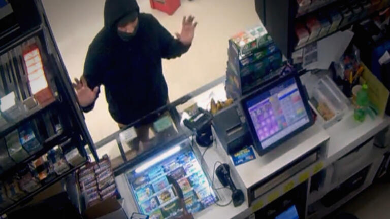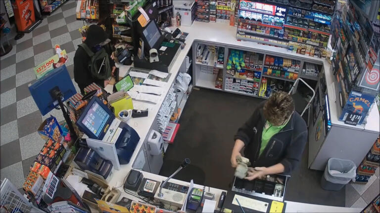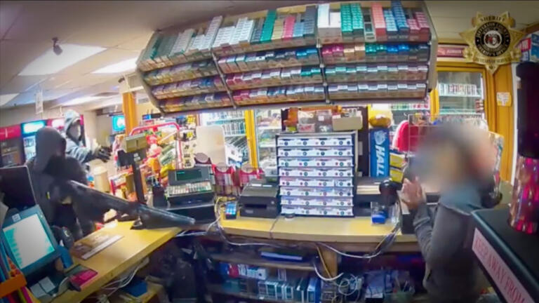 A gas station worker looks down the barrel of a gun; a man goes on a high-speed chase.