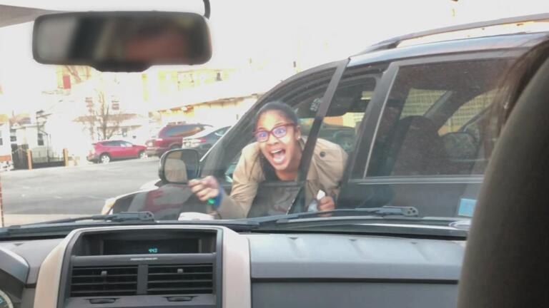 A family is horrified as an enraged woman appears to stab their vehicle.