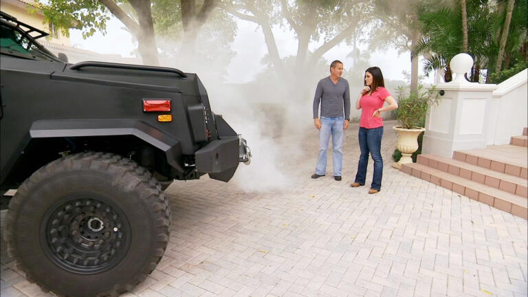 Jenn struggles to deliver an armored assault vehicle; Marc transports a daredevil motorcycle ride.