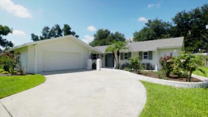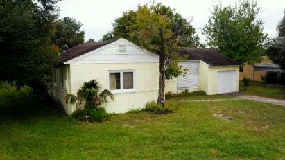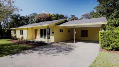A large corner lot is home to an ugly house that includes a master bath that opens into the hallway.